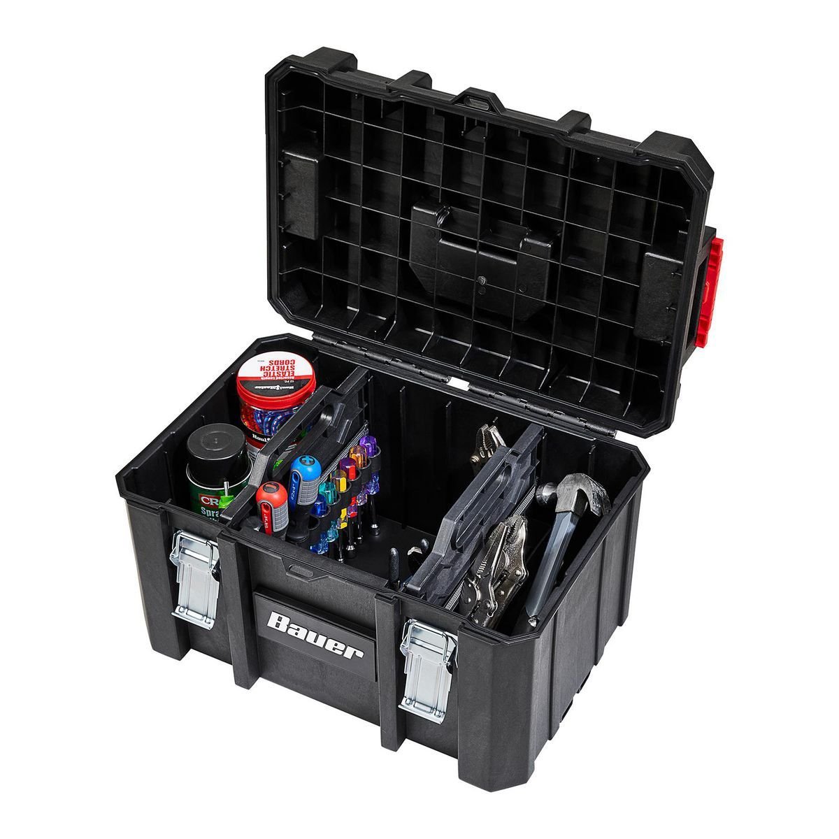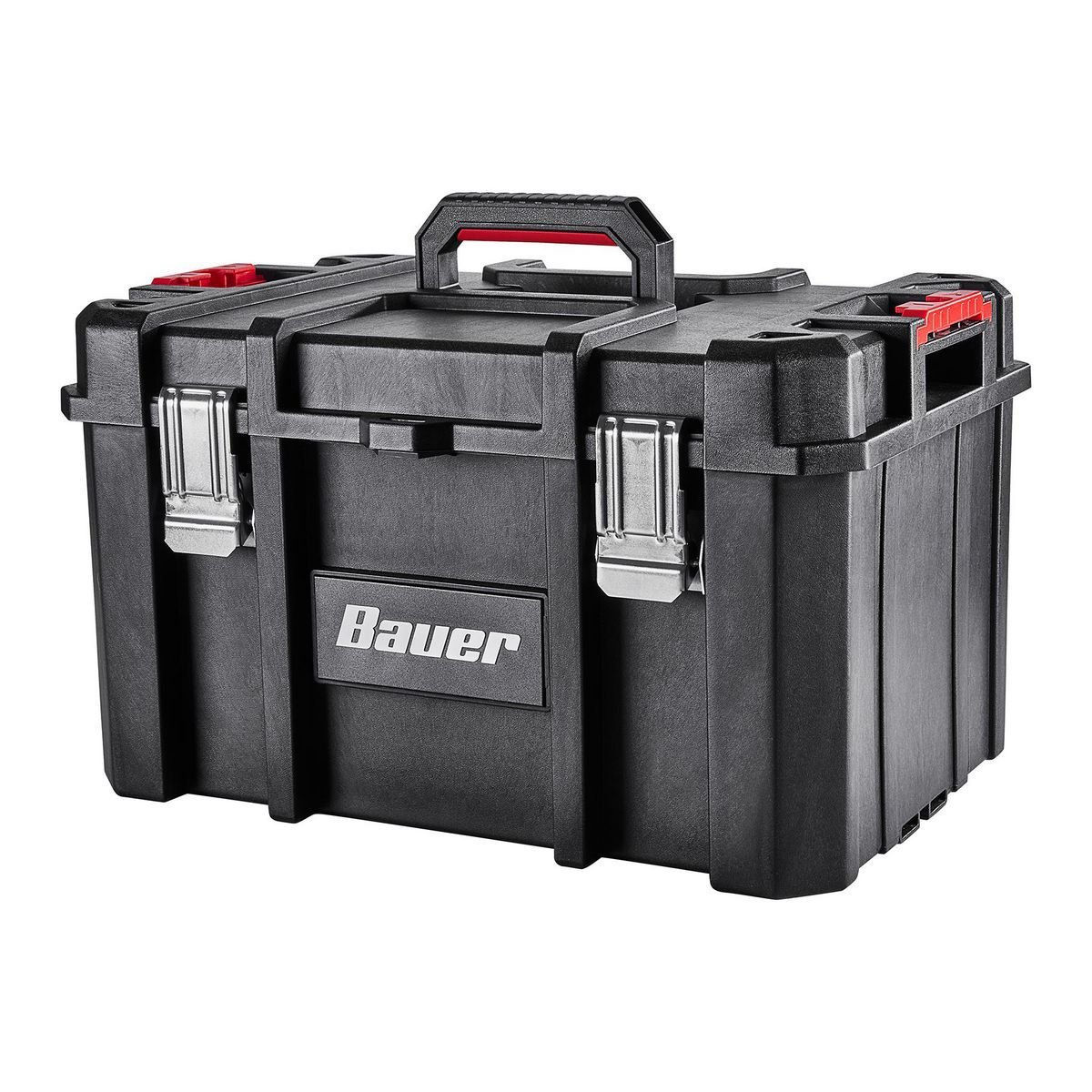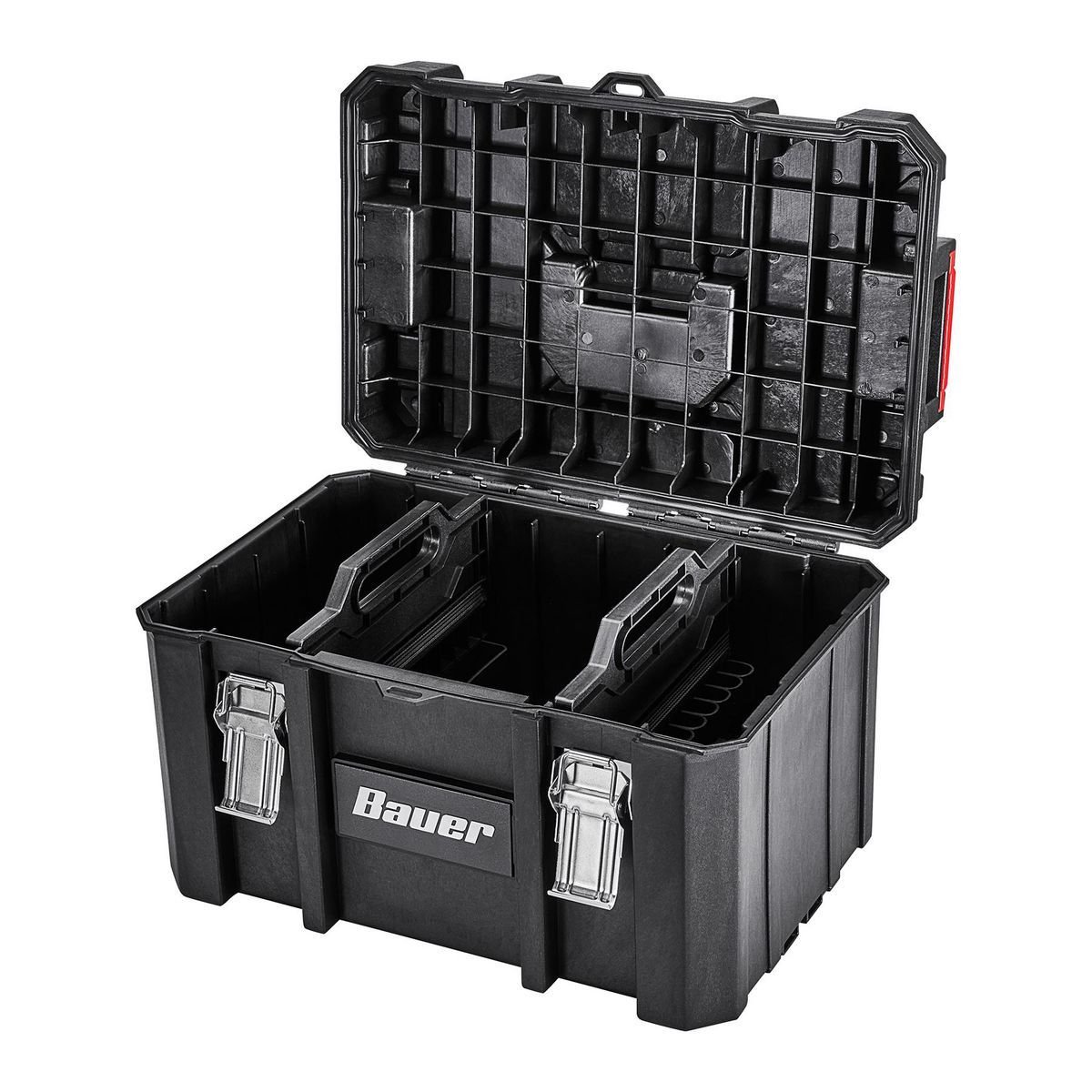 La caja de herramientas modular grande BAUER™ es ideal para organizar herramientas. Fabricada con resina de alto impacto, esta caja cuenta con tarjetas de herramientas removibles para organizar alicates, destornilladores y más. Los fuertes pestillos de metal mantienen las herramientas seguras durante el transporte. Con una capacidad de peso de 50 lb, esta caja es completamente compatible con el Sistema Modular de Almacenaje BAUER™. El organizador tiene una clasificación IP65 para resistencia al polvo y al agua. Personaliza tu almacenamiento para un acceso rápido a las herramientas esenciales.