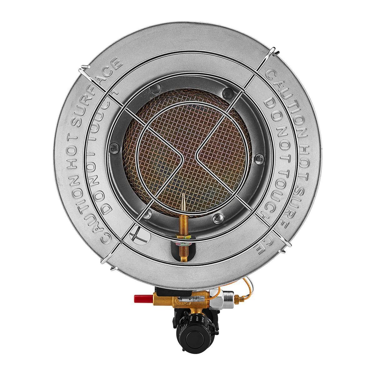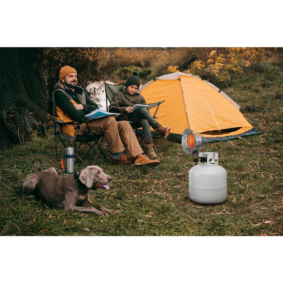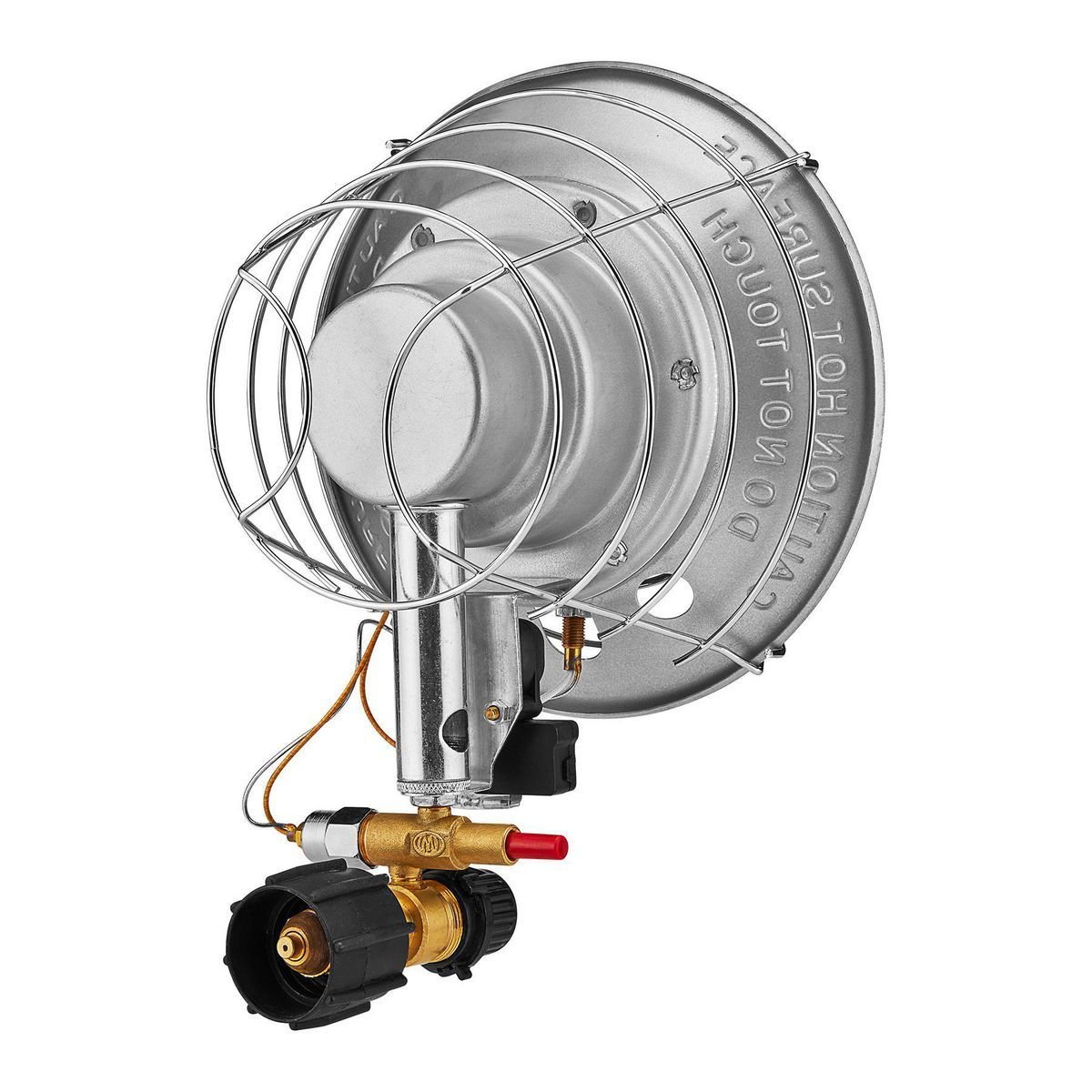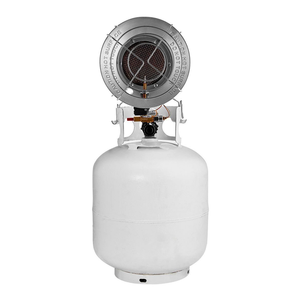 Este calefactor para exteriores que ahorra espacio utiliza calor radiante, lo que lo hace menos susceptible a la disipación por el viento. El calefactor se monta directamente a un tanque estándar de 20 lb. de gas LP y utiliza una conexión estándar de válvula de tanque ACME/OPD.