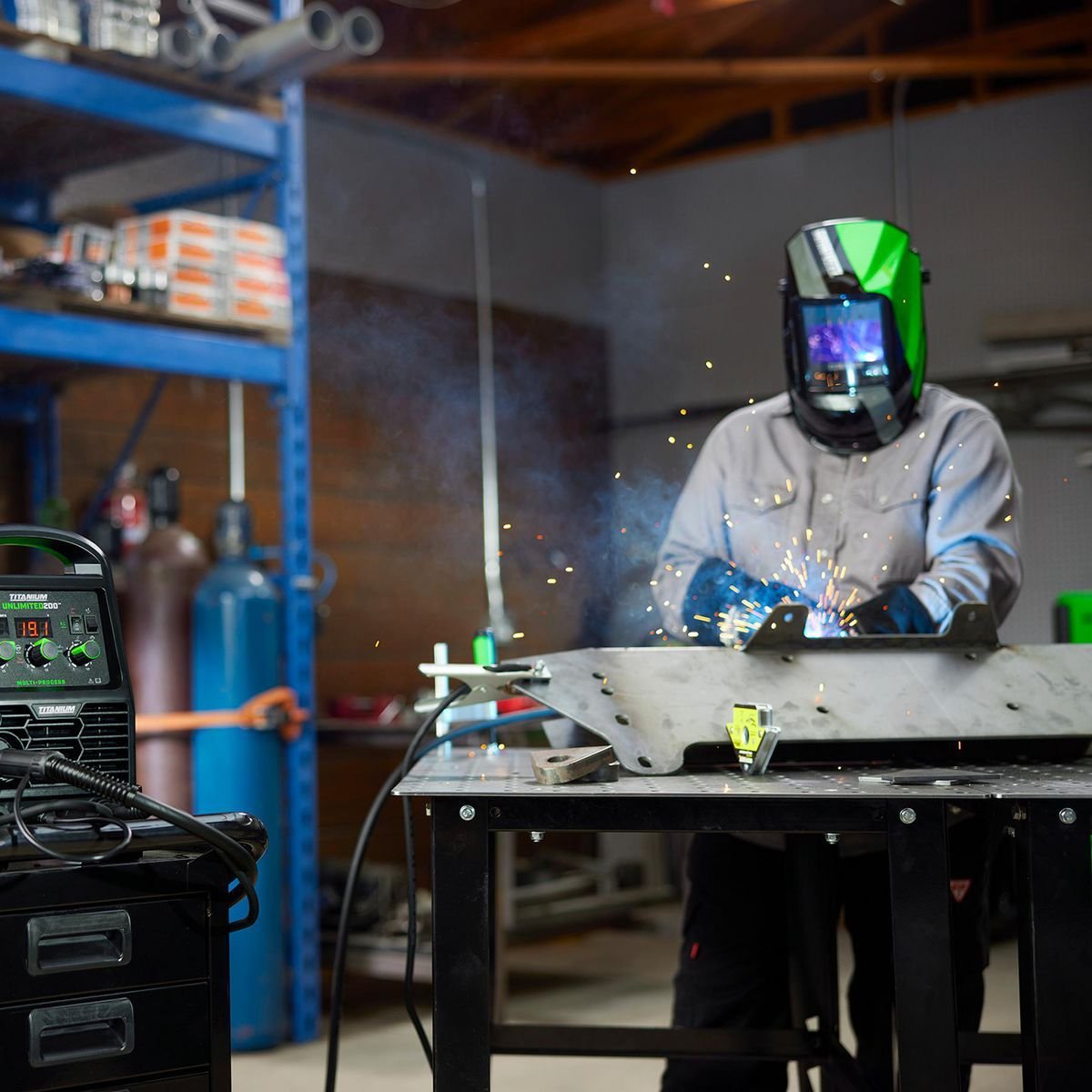 El control de tono variable ajusta de #5-8 (corte), #9-13 (soldadura) con un tono de descanso #4.