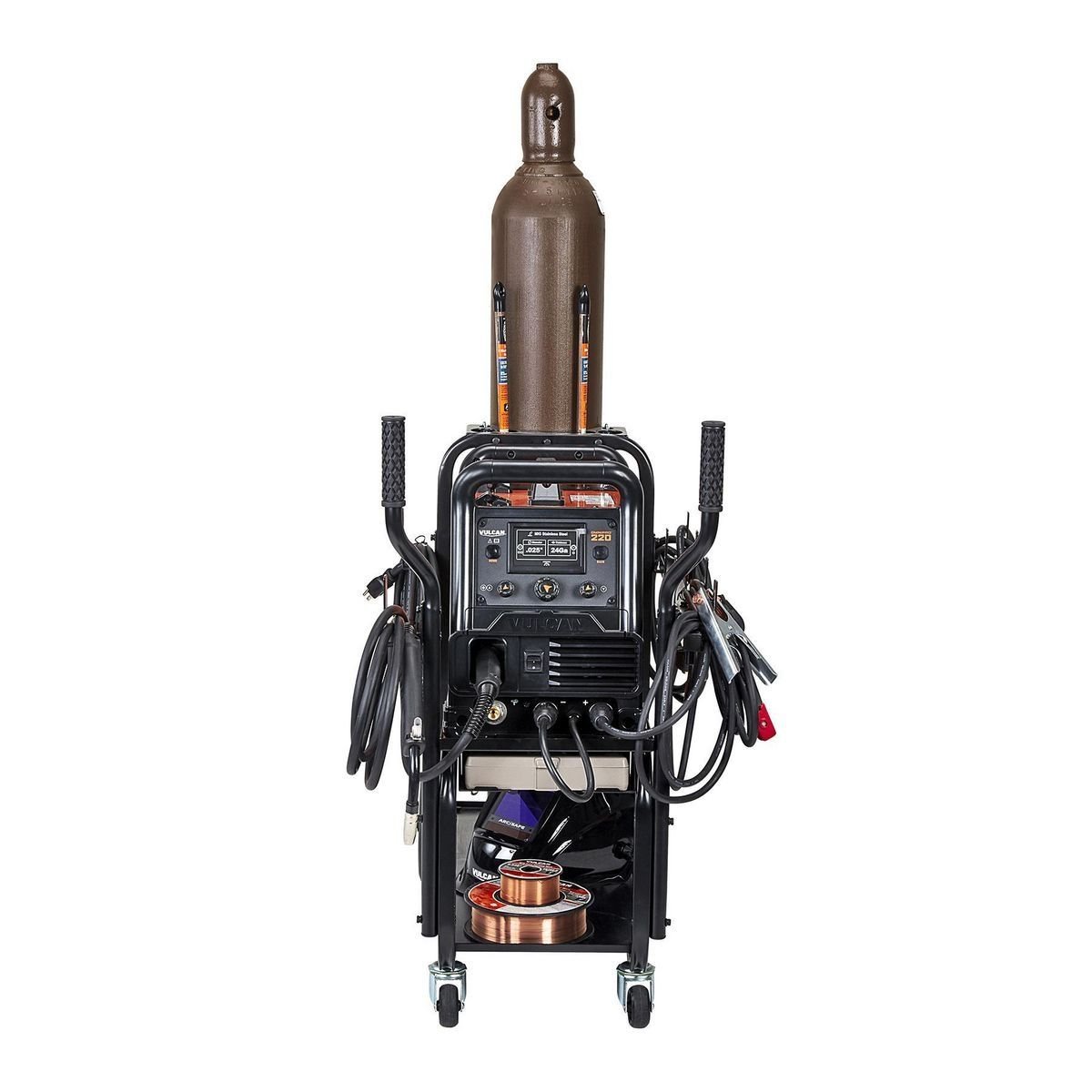 **El carro de soldadura VULCAN™ es un carrito fuerte que puede soportar hasta **350 libras**. Tiene un sistema especial para guardar los cables de soldadura de forma ordenada. El carro tiene un estante inclinado para que puedas acceder fácilmente a los controles de la soldadora, otro estante para el tanque de gas y un estante grande para guardar otras cosas. Las ruedas y las ruedas giratorias hacen que sea fácil moverlo. Funciona con muchas marcas de soldadura populares, como Harbor Freight, Chicago Electric, Titanium y Vulcan. También funciona con otras marcas como LINCOLN ELECTRIC, HOBART, MILLER, ESAB y FORNEY.**