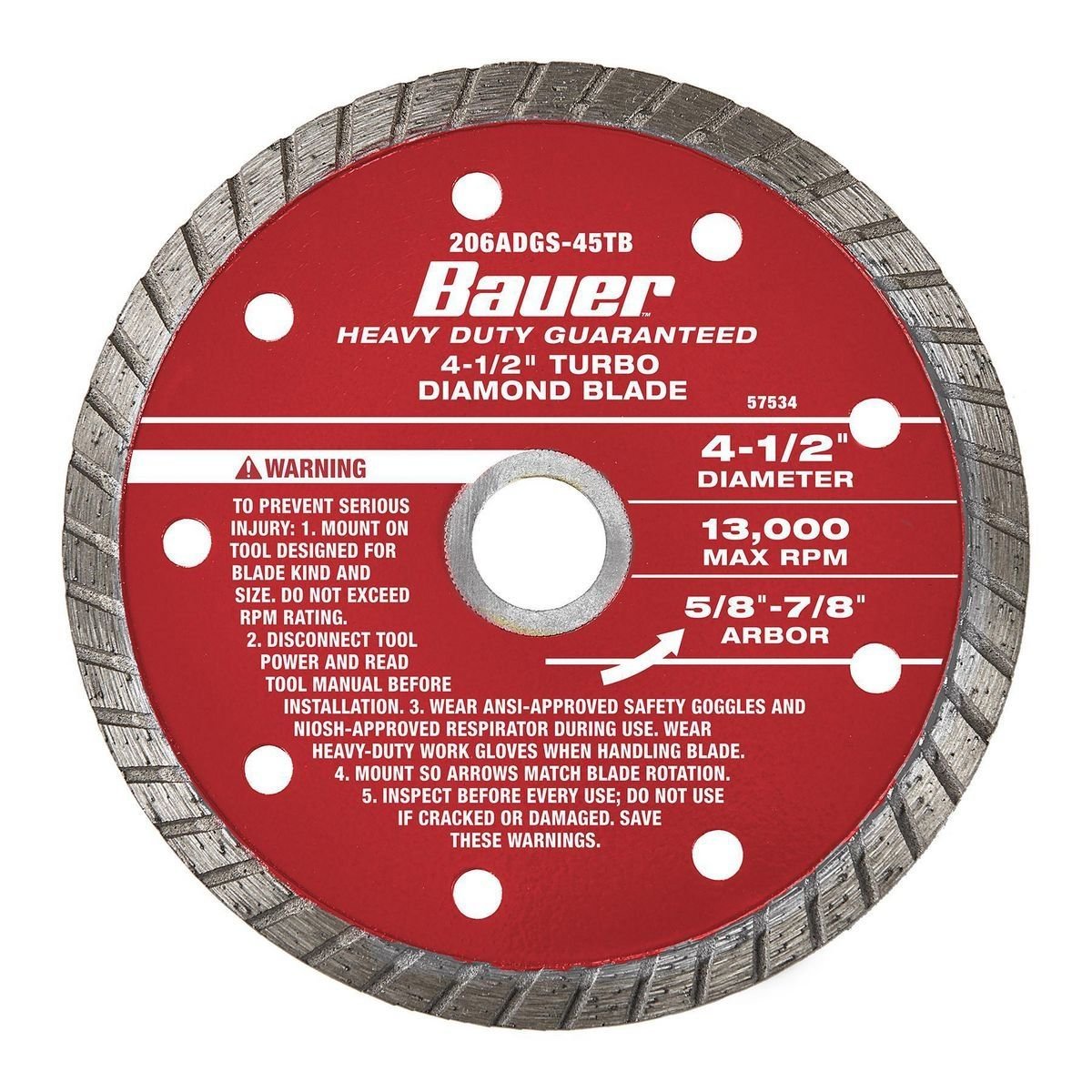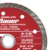 La Sierra de Diamante Turbo BAUER™ de 4-1/2 pulgadas es ideal para el corte general de ladrillos, concreto, mampostería, piedra, estuco y baldosas. El diseño de bisel turbo crea un acabado más limpio y suave que una hoja segmentada. Los diamantes de alta calidad y una matriz de unión premium ofrecen un rendimiento duradero al cortar en húmedo o en seco. Esta hoja está diseñada para amoladoras angulares con cable o sin cable.