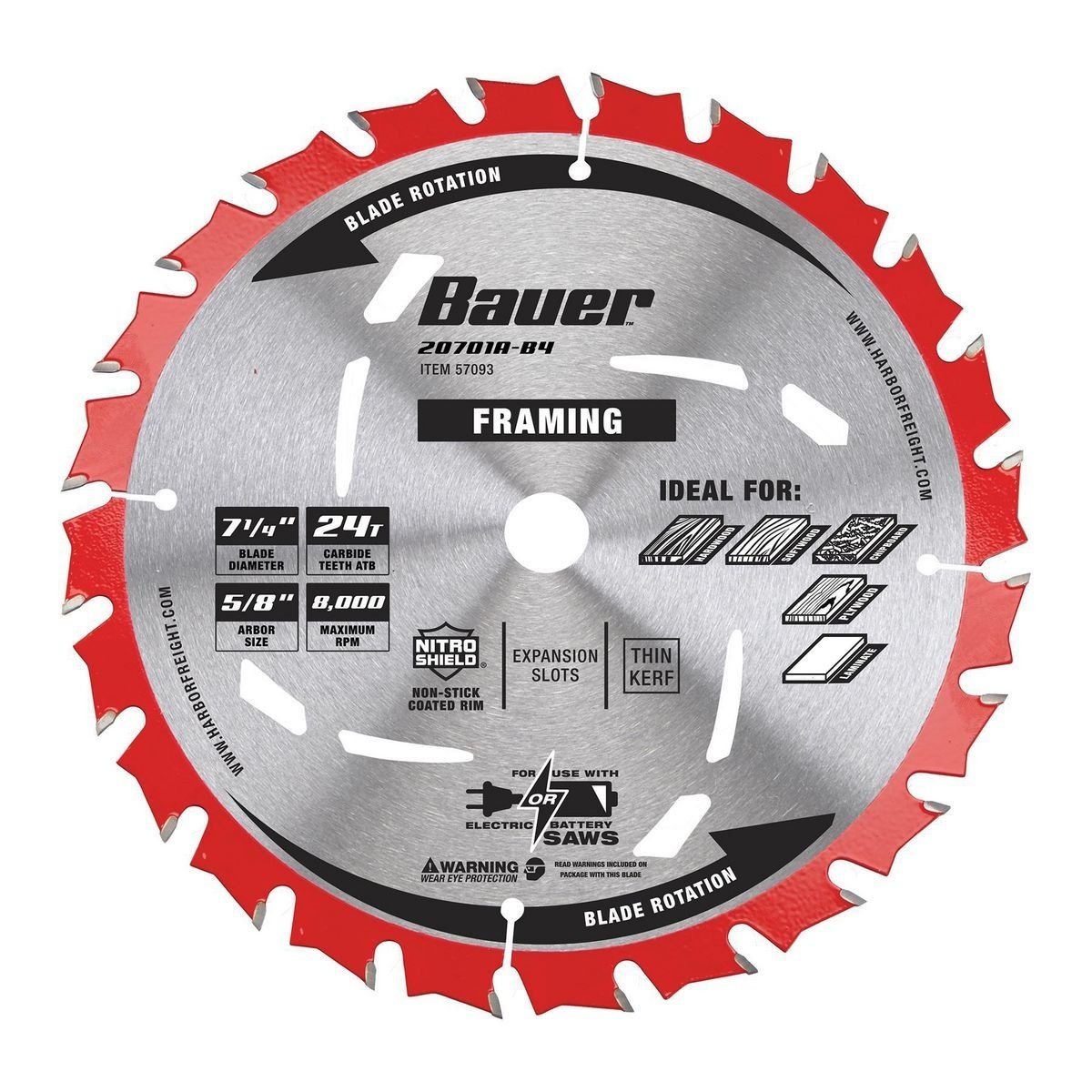 La hoja de sierra circular para enmarcar 24T de BAUER™ tiene dientes de carburo C3 de grado de construcción súper afilados para cortes rápidos en la mayoría de los tipos de madera de construcción. El revestimiento antiadherente Nitro Shield™ protege la hoja del calor, el engomado y la corrosión. Las ranuras de expansión mantienen la hoja funcionando correctamente después de repetir los cortes.