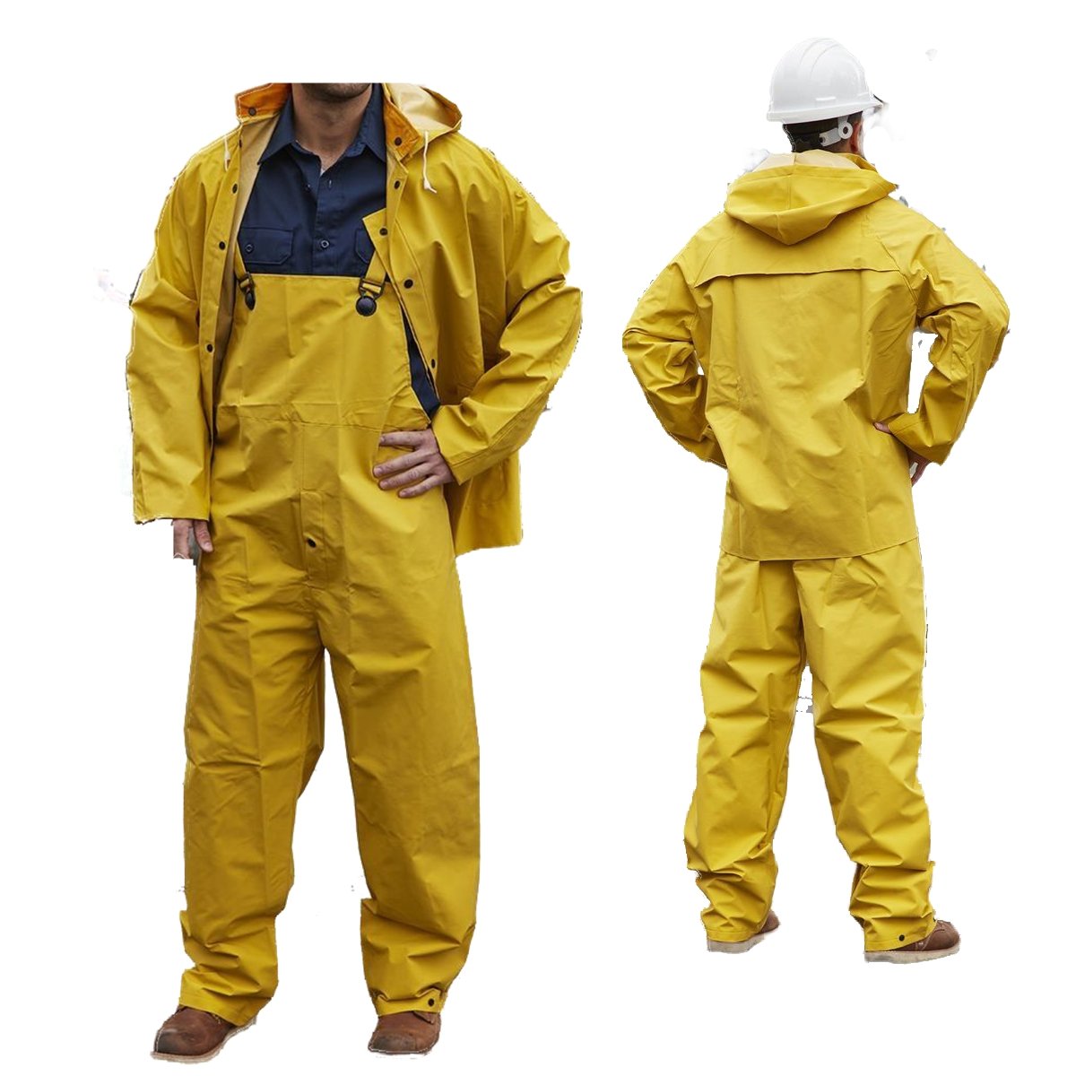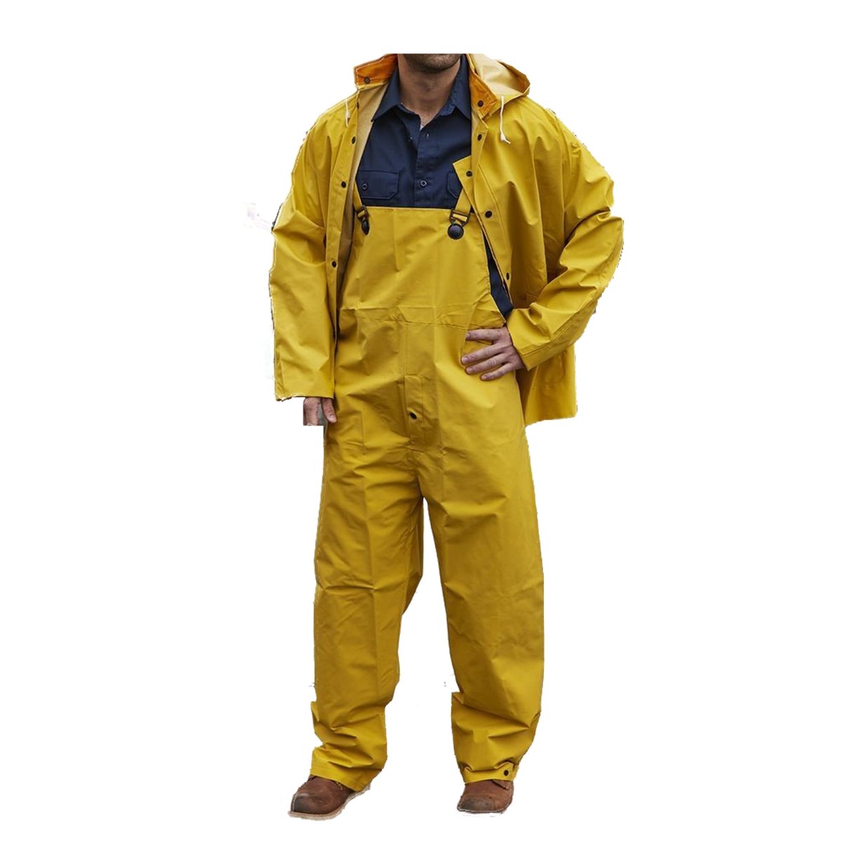 El material de PVC/poliéster de alta calidad de este traje de lluvia lo mantiene seco en condiciones húmedas y lluviosas. Las características incluyen correas ajustables en la cintura y broches en los tobillos y los puños para proporcionar un ajuste cómodo y ceñido. El traje de lluvia tiene ventilaciones en las axilas para mantenerte fresco mientras trabajas.