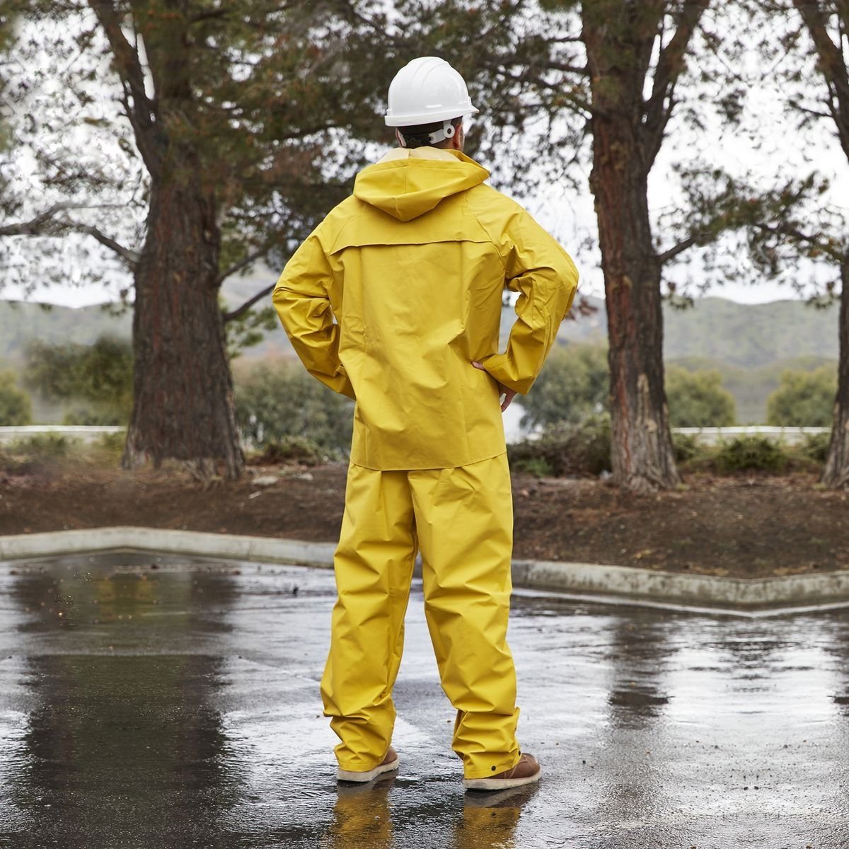 El material de PVC/poliéster de alta calidad de este traje de lluvia lo mantiene seco en condiciones húmedas y lluviosas. Las características incluyen correas ajustables en la cintura y broches en los tobillos y los puños para proporcionar un ajuste cómodo y ceñido. El traje de lluvia tiene ventilaciones en las axilas para mantenerte fresco mientras trabajas.