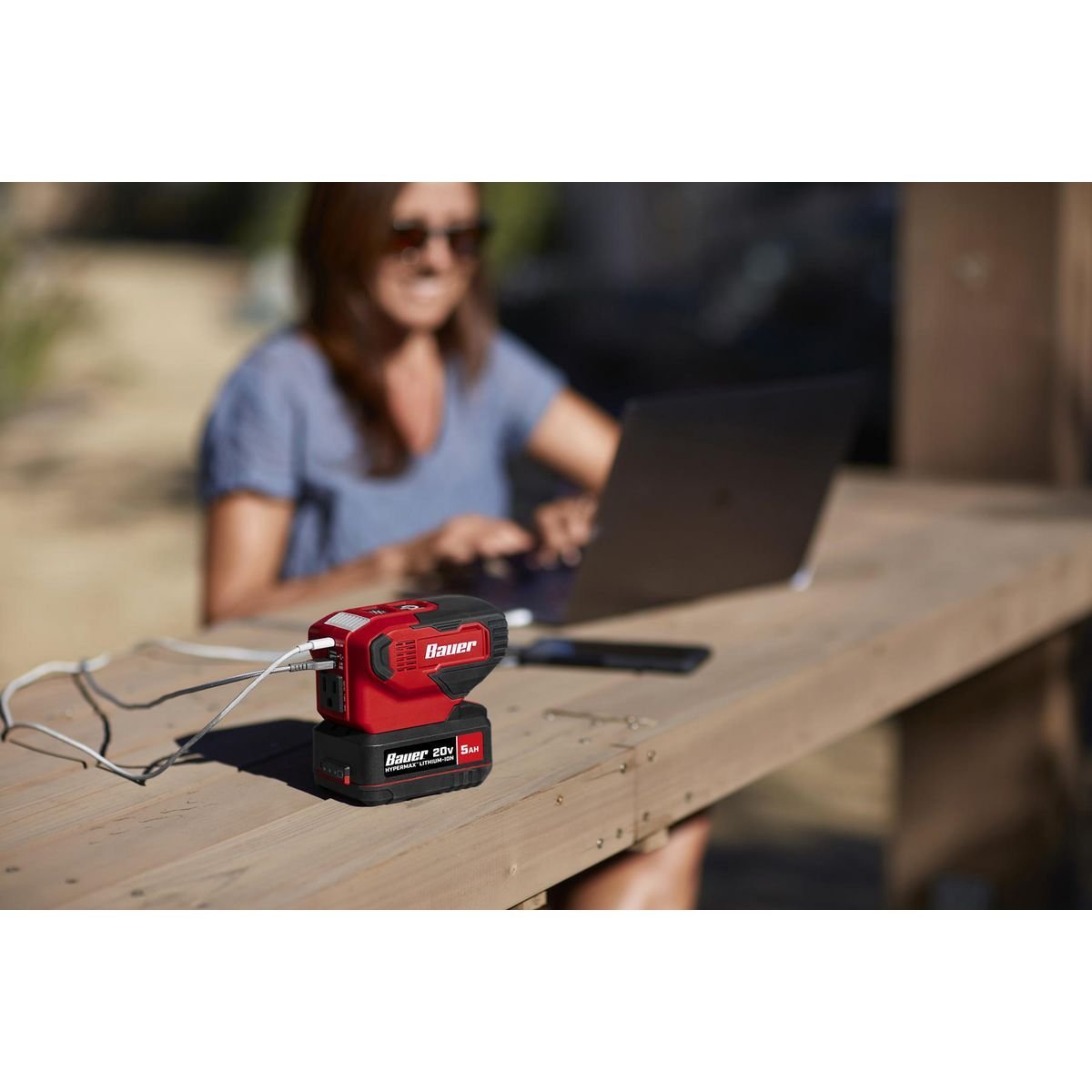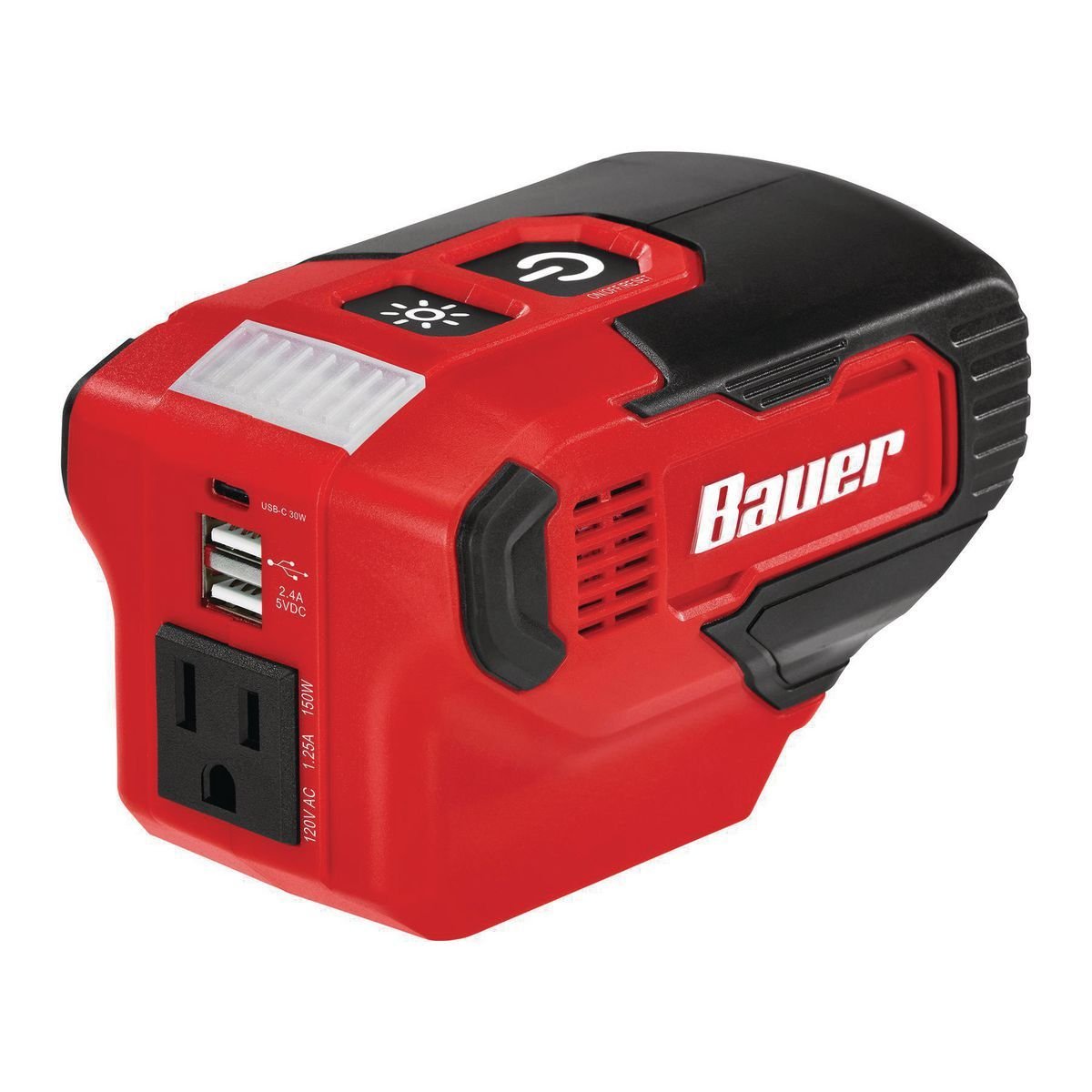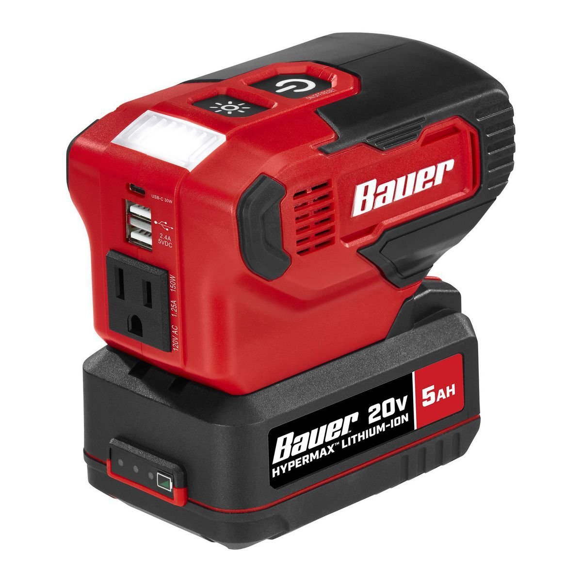 El inversor de batería BAUER™ 20V 190 Watt Power Source alimenta todos tus artículos esenciales al mismo tiempo. Este inversor es ideal para cargar laptops, tabletas, teléfonos móviles, ventiladores, luces y otros dispositivos pequeños. El inversor es compatible con todas las baterías BAUER™ 20V para tener energía en cualquier lugar.