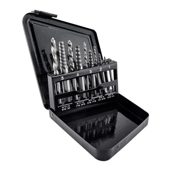 Diseñado para remover espárragos, pernos, tornillos de cabeza hueca y conexiones rotas. Fabricado con acero al alto carbono reforzado para mayor durabilidad, soportando múltiples usos sin sacrificar la calidad. Un juego versátil que viene en un práctico estuche metálico con índice de almacenamiento que se puede colgar fácilmente en ganchos para tableros perforados, permitiendo un acceso rápido. Ahorre tiempo y dinero con este juego que incluye tanto extractores de tornillos como brocas de giro a la izquierda para realizar el trabajo.