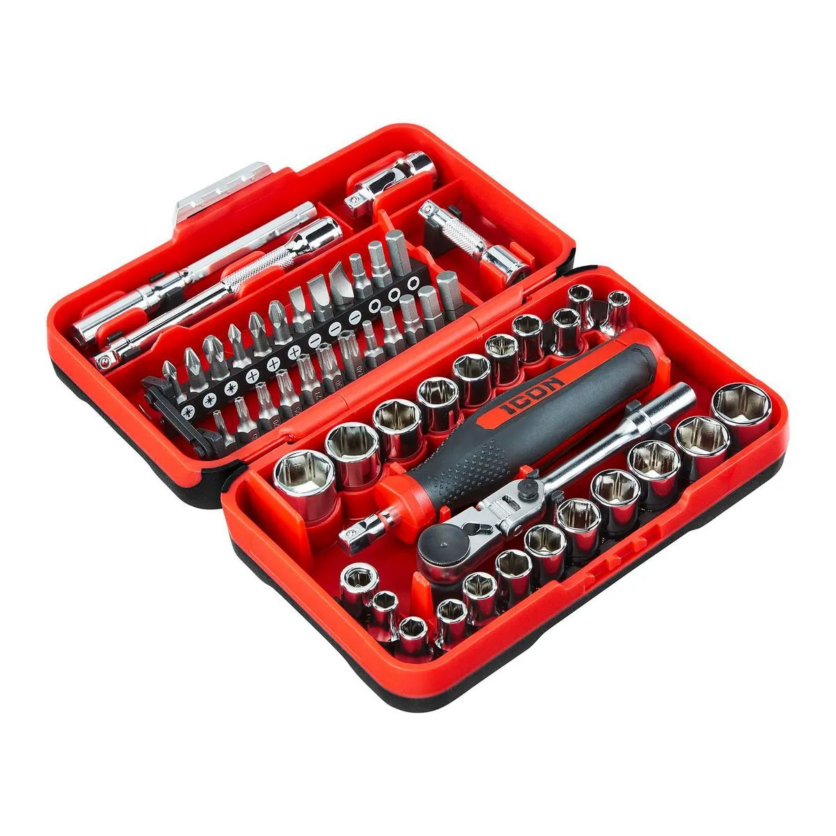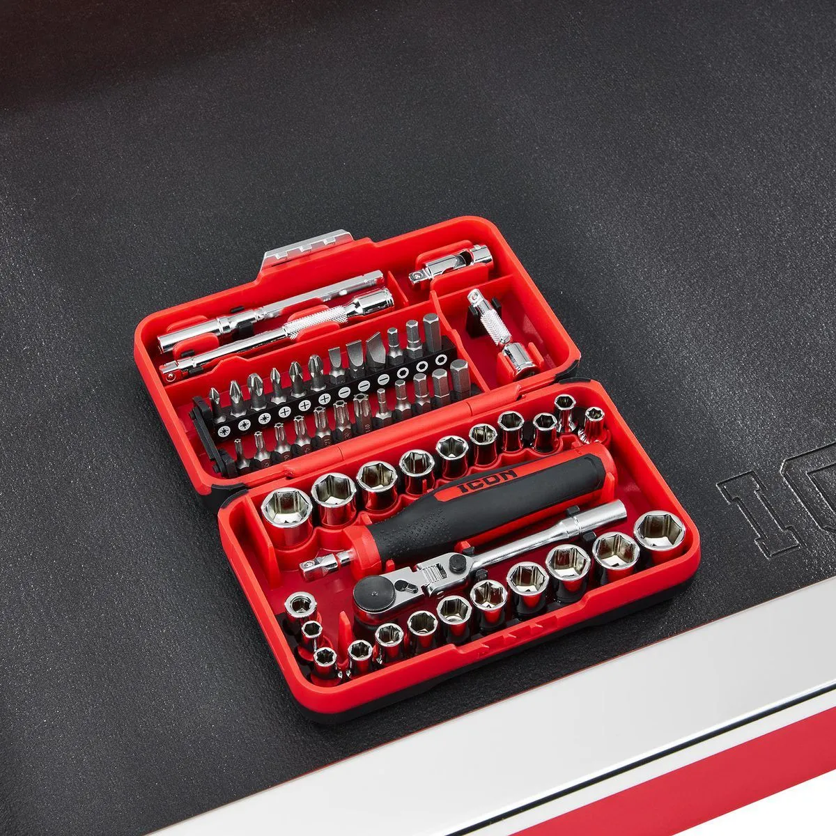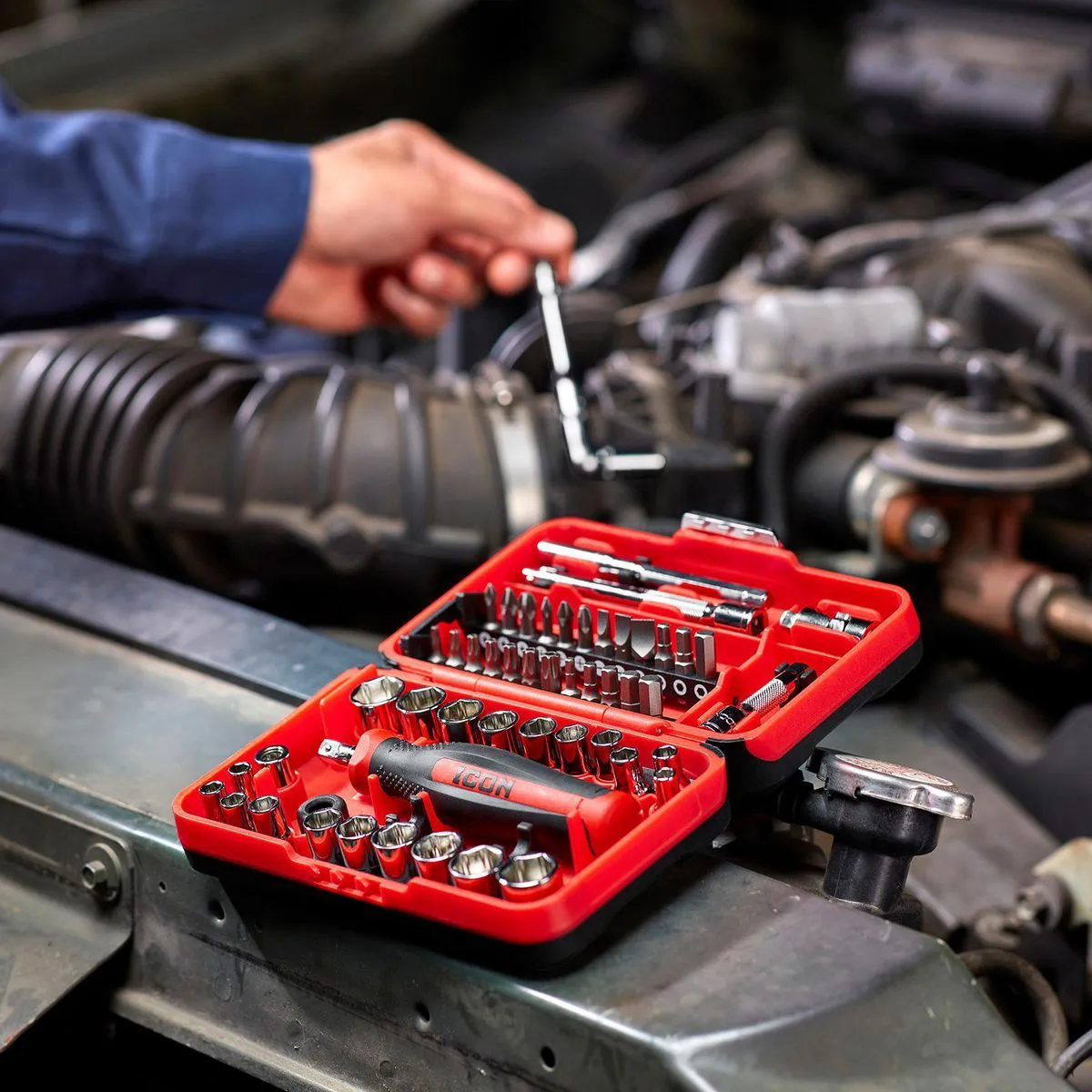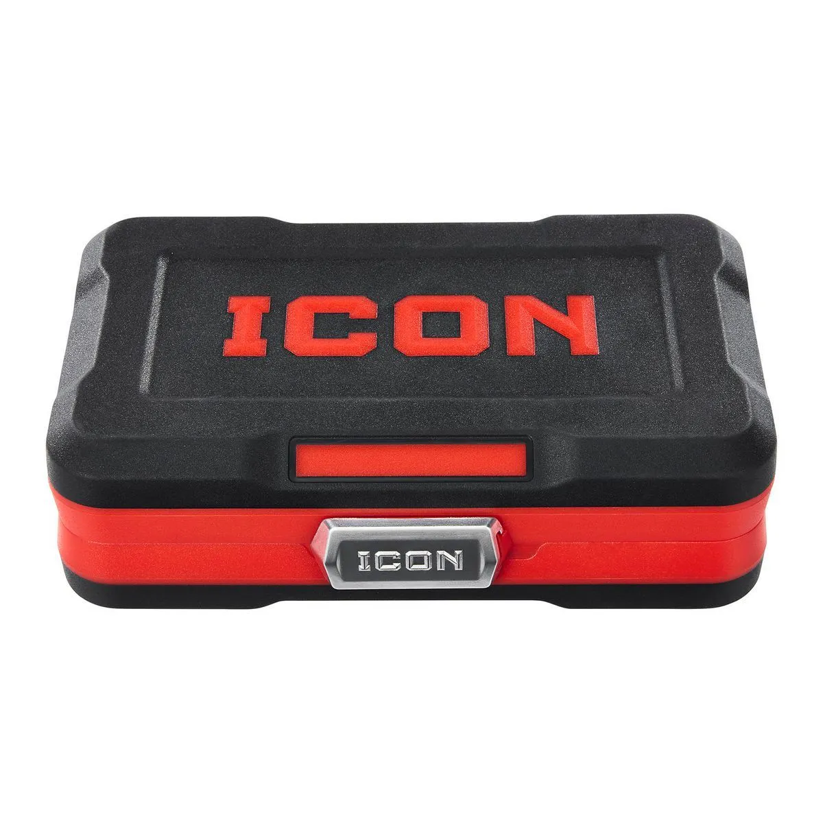 Este Juego Profesional de Dados y Puntas ICON™ Compact incluye una carraca articulada con cabezal flexible con bloqueo de alta durabilidad, mango giratorio ergonómico, extensiones, una junta universal de alta resistencia y una selección completa de las puntas y dados de 1/4 pulg. más comúnmente utilizados. Como todas las herramientas manuales ICON™, este juego de carraca y puntas cuenta con una garantía de por vida del fabricante, sin complicaciones.
