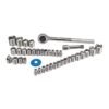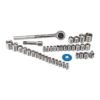 Incluye 32 dados estándar, tres dados de 8 puntas, trinquete de accionamiento directo de 3/8 pulg., dedo giratorio, extensión de 2-3/4 pulg., adaptador de 3/8 pulg. a 1/4 pulg. y estuche de PVC con tapa transparente .