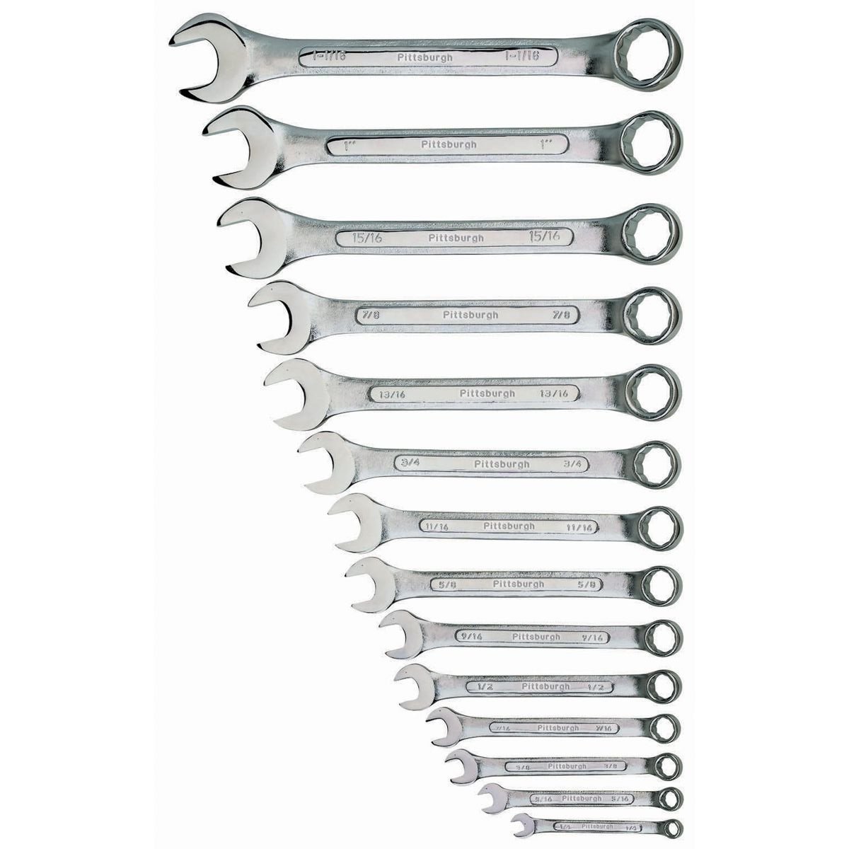 Estas llaves combinadas PITTSBURGH® tienen extremos de caja de 12 puntas con un panel elevado para mayor resistencia y fácil identificación. Con extremos abiertos con ángulo de 15 grados y una construcción resistente de acero al cromo vanadio, estas llaves son lo suficientemente fuertes para durar.