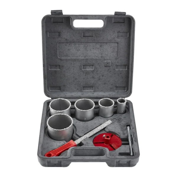 Contenido: Sierras perforadoras: 1-1/4 in., 2-1/8 in., 2-5/8 in., 2-7/8 in., 3-1/4 in.; Broca piloto: 3/8 in.; Placa de soporte; Lima manual con recubrimiento de carburo; Estuche de almacenamiento