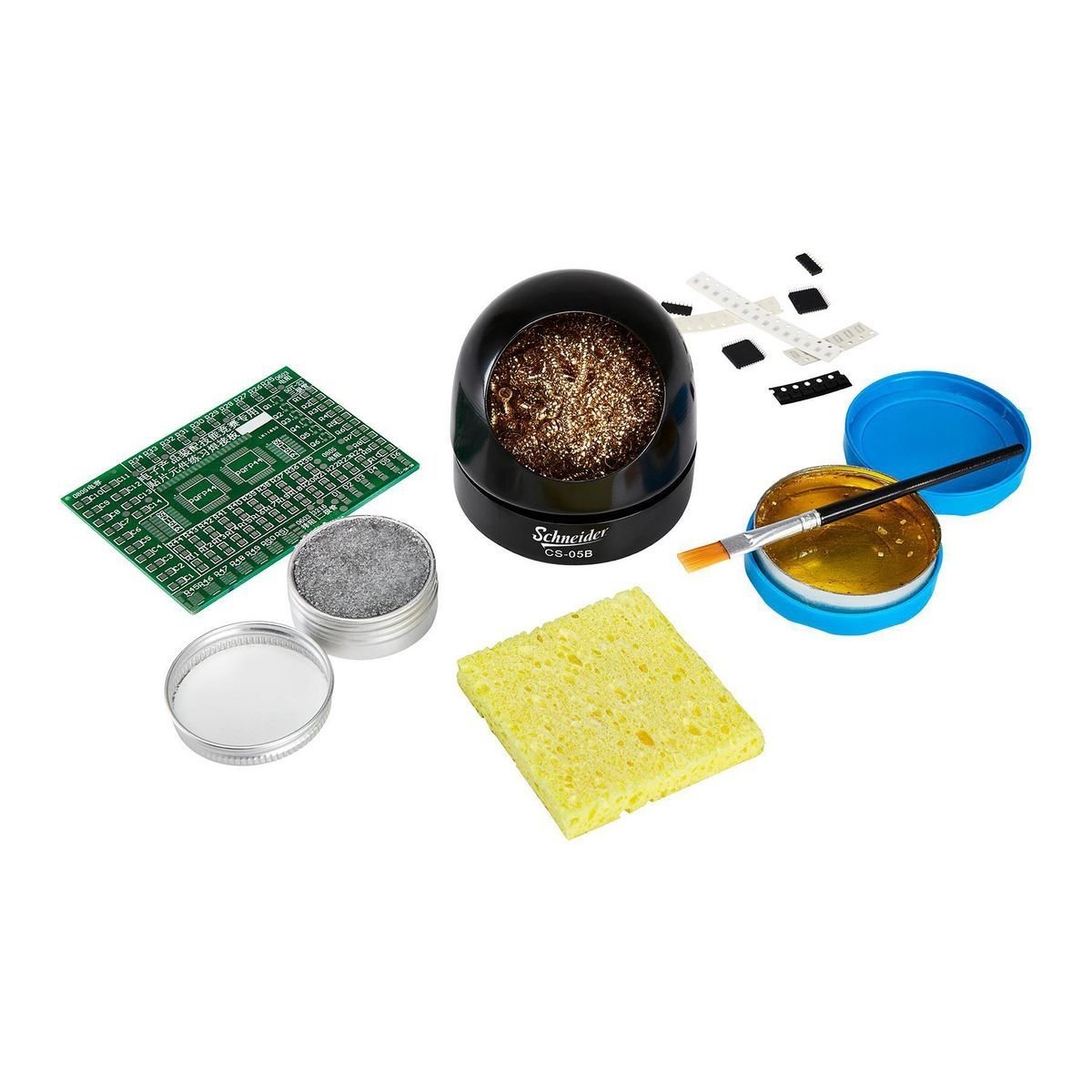 El kit de accesorios SCHNEIDER™ proporciona todas las herramientas necesarias para limpiar puntas de soldadura y aplicar fundente de colofonia para juntas de soldadura fuertes.