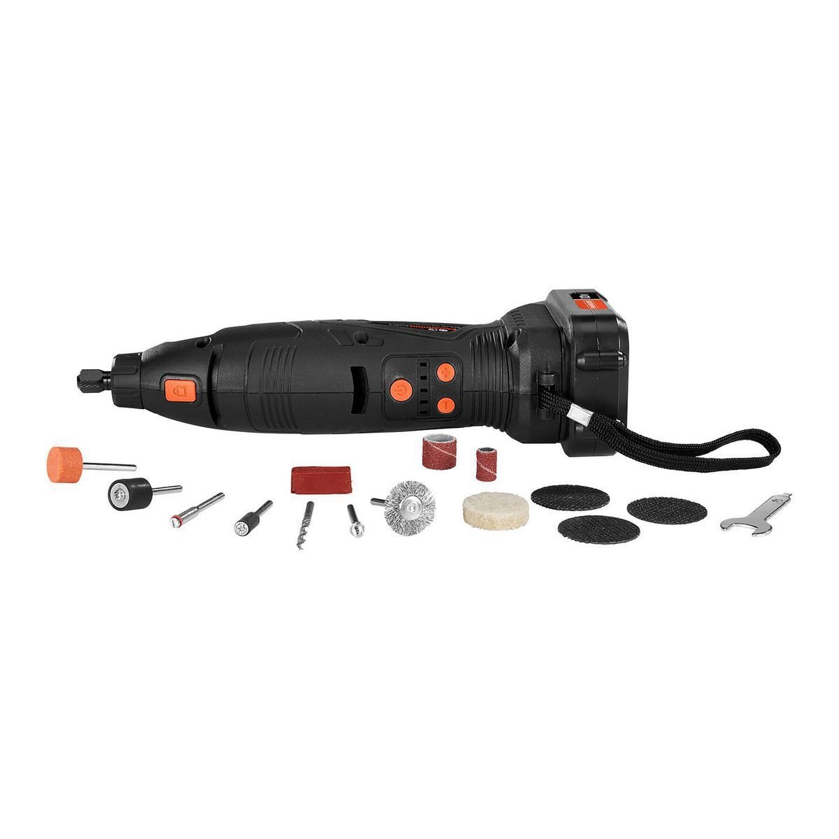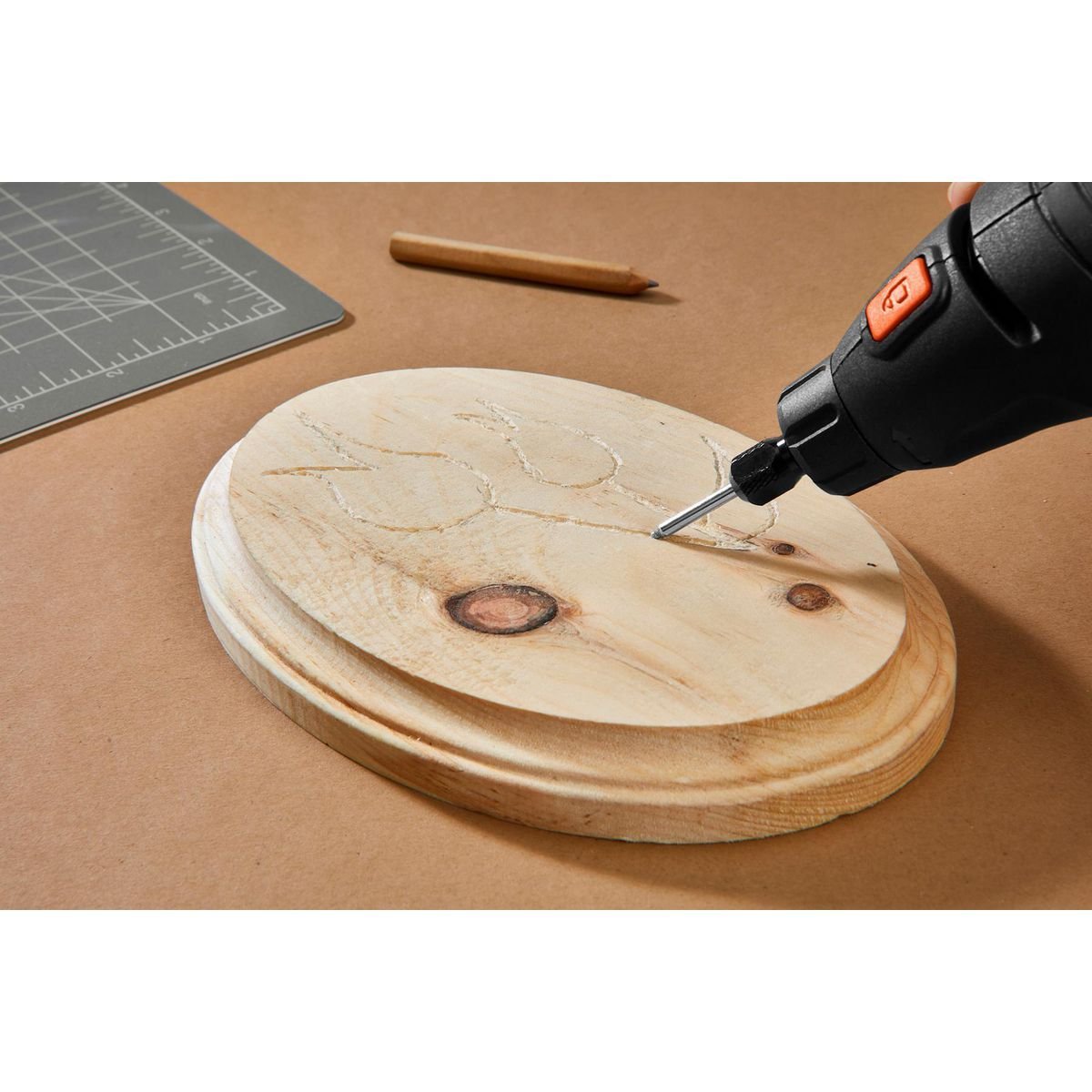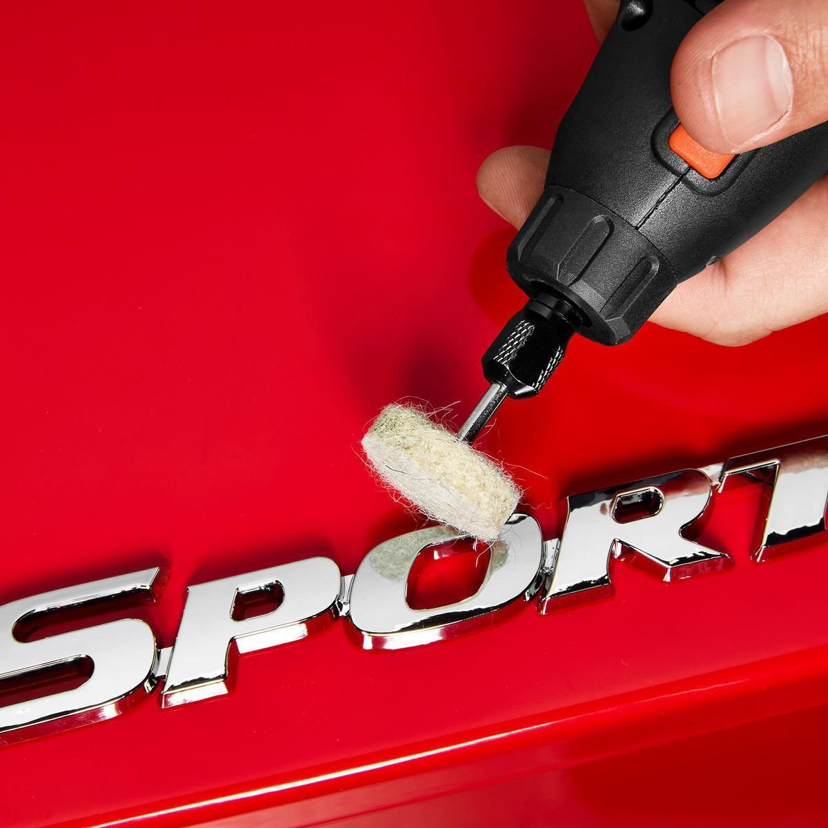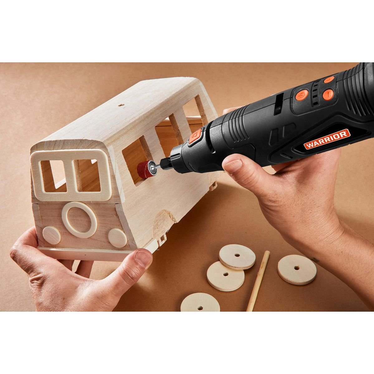 Este kit incluye 16 accesorios para lijar, tallar, grabar y pulir proyectos de propósito general. La herramienta está optimizada para trabajos de intensidad media en madera y metales blandos.