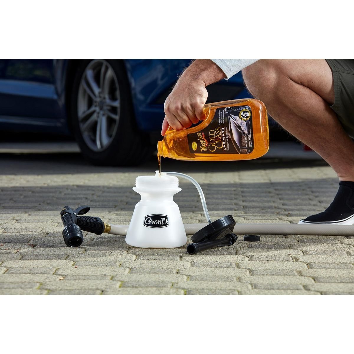 La pistola rociadora de espuma extrema GRANT'S ™ hace que sea rápido y fácil remojar previamente su automóvil, SUV, camión, bote, RV o vehículo recreativo con una capa gruesa de espuma antes de usar su guante de lavado y balde. Esta pistola de espuma GRANT'S™ simplemente se conecta a cualquier manguera de jardín para una instalación rápida y fácil, al mismo tiempo que genera una espuma extremadamente espesa que ayuda a aflojar y levantar la suciedad sin cepillar ni restregar el acabado del vehículo. Las 32 onzas. El depósito de jabón es translúcido para ver fácilmente la mezcla de jabón restante, mientras que la empuñadura de pistola de desconexión rápida se separa rápidamente para enjuagar fácilmente. Instrucciones de uso: llene la botella extra grande de 32 oz. depósito de jabón con una mezcla de su jabón de lavado de autos favorito y agua, generalmente en una proporción de entre 3 y 5 partes de agua por cada parte de jabón (aproximadamente entre 6 y 10 onzas de jabón, con el resto lleno con agua corriente). Para la espuma más espesa, una mayor concentración de jabón normalmente produce los mejores resultados.