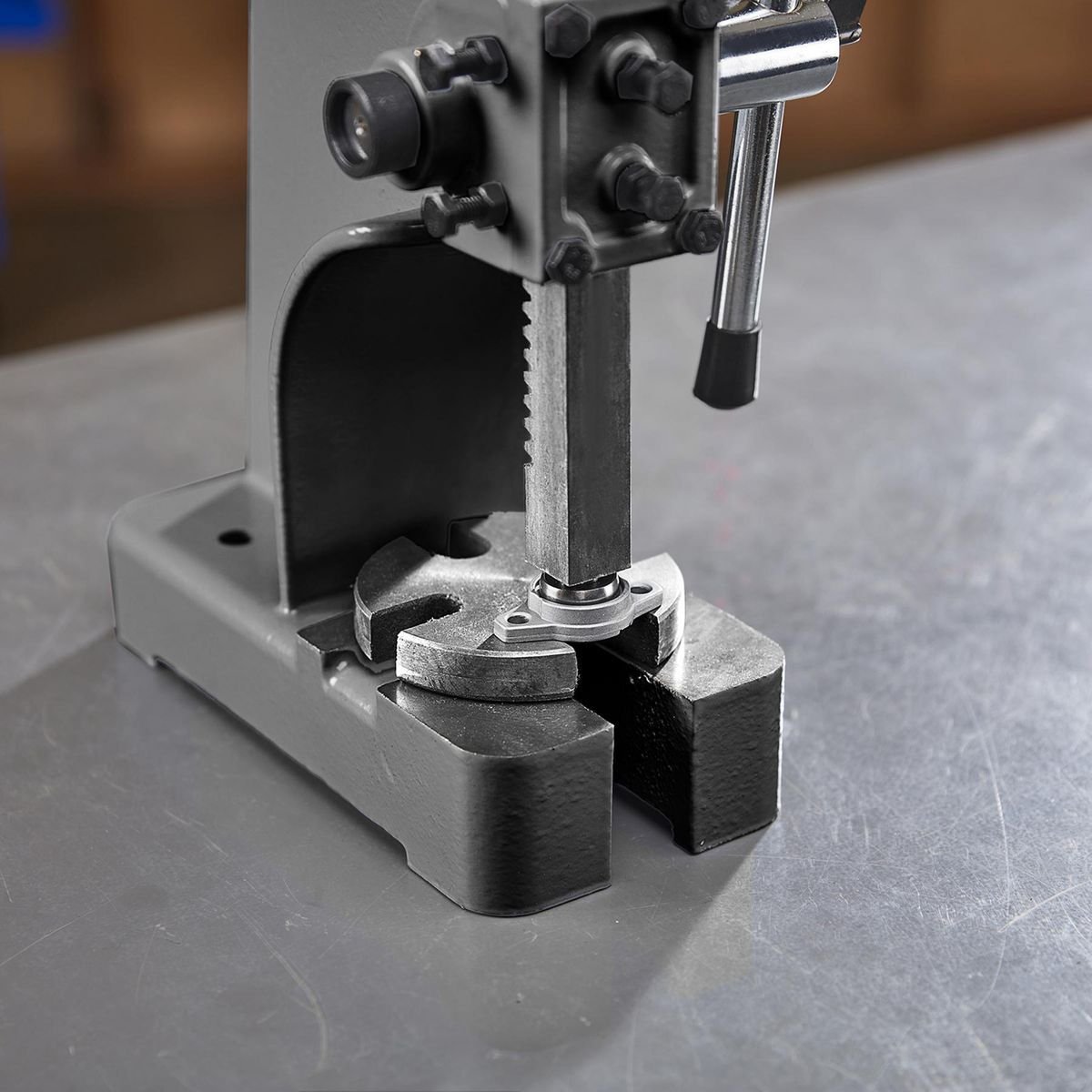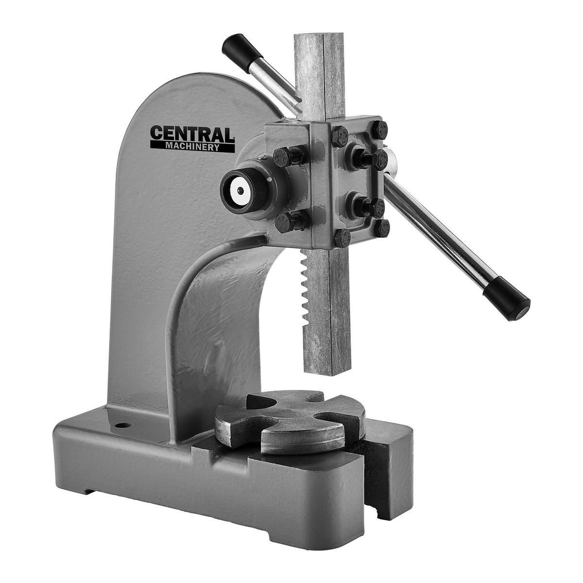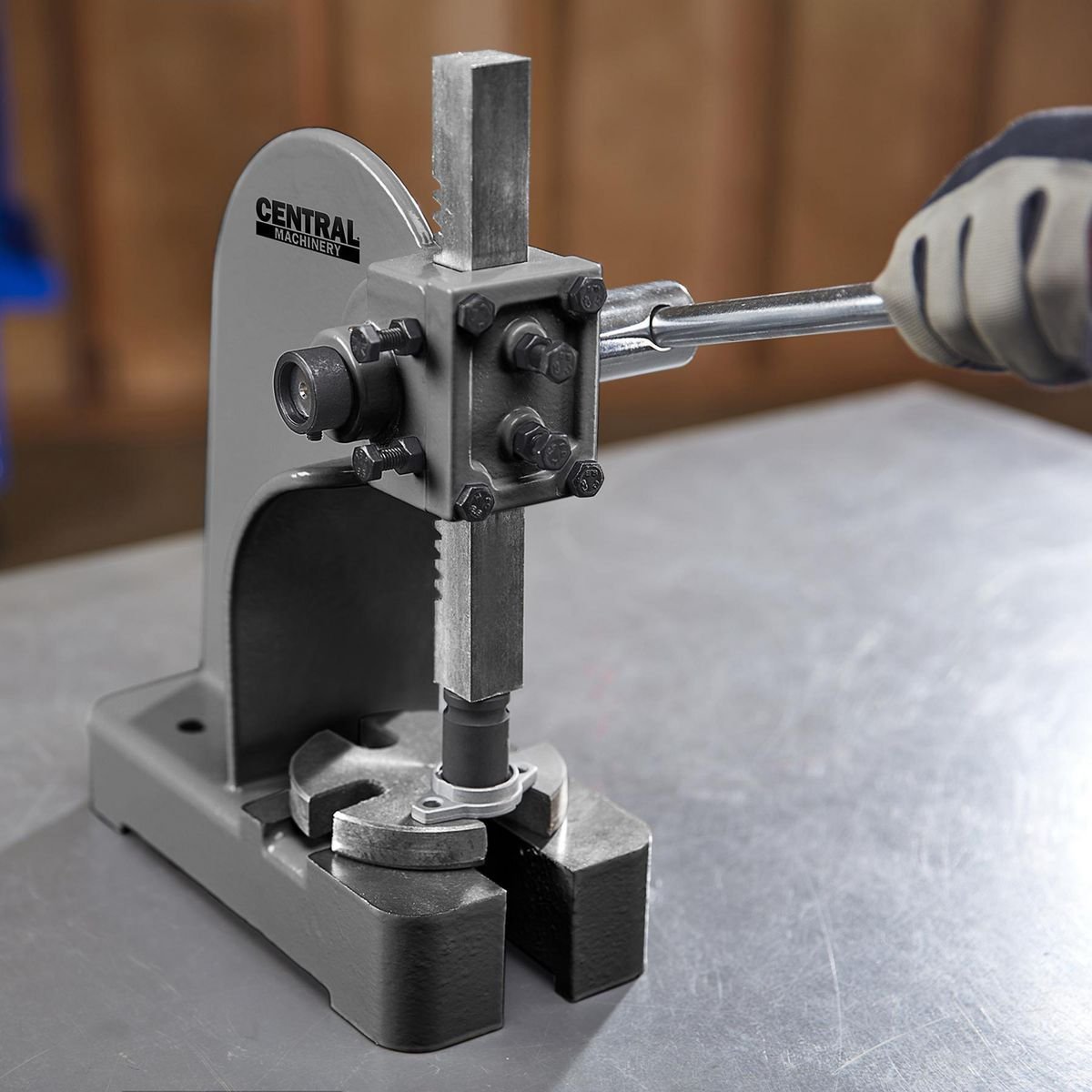 Tiene agujeros preperforados en la base para montarlo directamente en el banco de trabajo. Proporciona una fuerza de 2000 lb. para presionar bujes, rodamientos, chavetas y otras piezas pequeñas.
