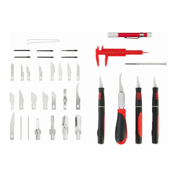 Kit completo: además de las cuchillas y porta cuchillas, incluye pinzas, calibrador y desarmadores de precisión.