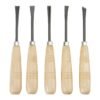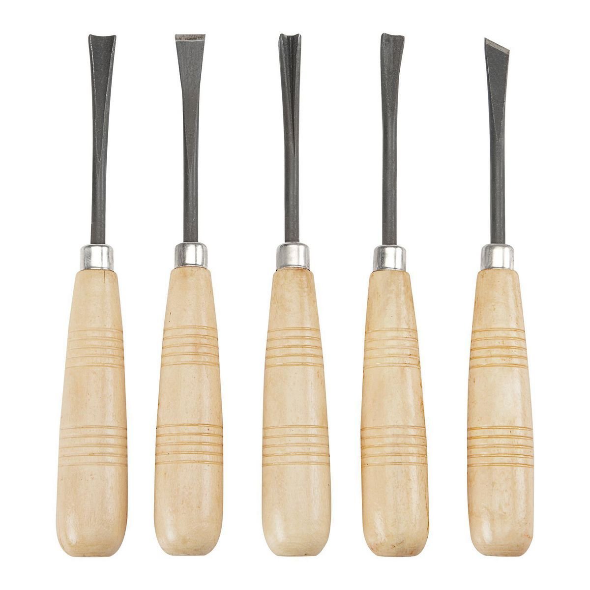 Viene con cinco tipos de cinceles distintos para diferentes usos: uno en forma de V, uno curvo poco profundo, uno curvo más profundo, uno en ángulo (sesgado) y uno recto. Son ideales para tallar figuras, hacer detalles finos o trabajos generales de carpintería.