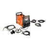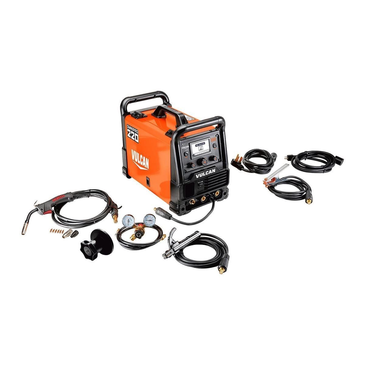 Accesorios incluidos Pistola de soldadura MIG Vulcan 180A 10 pies, boquilla de gas y gas (1 unidad), revestimiento de cable, puntas de contacto de 0,030 pulgadas (2 unidades), cable de trabajo y abrazadera de 10 pies con conexión estilo DINSE, cable de 10 pies con conexión estilo DINSE, regulador de flujo de aire Ar / CO2 y manguera de 6 pies, bobina de 2 lb de alambre de núcleo de flujo Vulcan de 0,030 pulgadas, bobina de 2 lb de alambre MIG Vulcan de 0,030 pulg. - Rodillo de impulsión de 0,035 pulgadas de ranura, rodillo de accionamiento moleteado de 0,030-0,045 pulg., Cable de entrada de 115 V con conector (NEMA 5-15P) 10 pies, cable de entrada de 230V con enchufe (NEMA 6-50P)