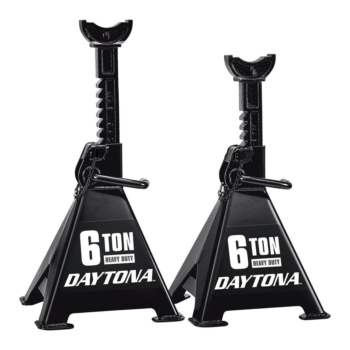 Estos soportes de gato cuentan con un sistema de trinquete fácil de usar para realizar ajustes de altura rápidos y pasadores de movilidad de doble bloqueo para mayor seguridad.